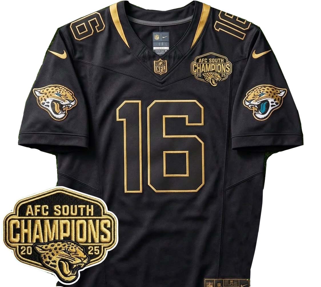Men’s #16 Trevor Lawrence Black Jacksonville Jaguars AFC South Champions 2025 patch Vapor Gold Limited Jersey