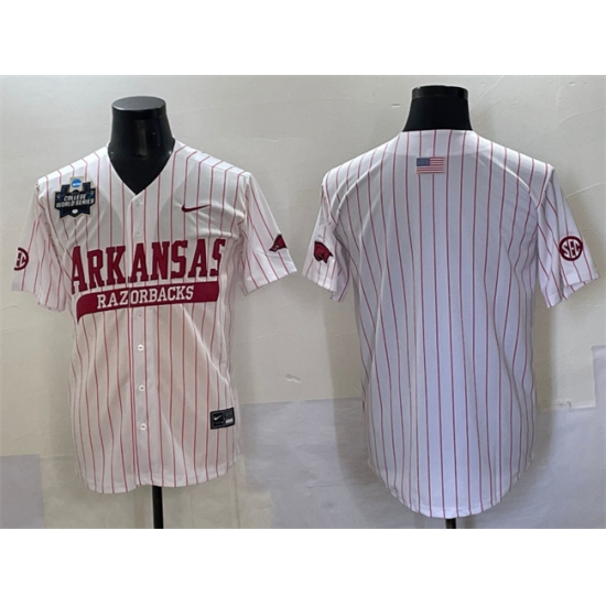 Men’s Arkansas Razorbacks Blank White Pinstripe 2025 World Series & SEC Patch Stitched Jersey