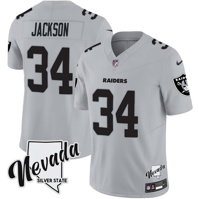 Men’s Las Vegas Raiders #34 Bo Jackson Grey F.U.S.E With Nevada Silver Stat Patch Vapor Stitched Football Jersey