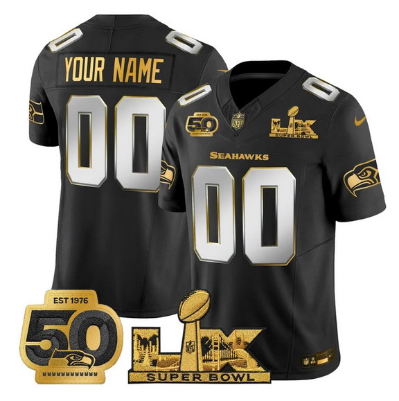 Men’s Seattle Seahawks Active Player Custom Black 2025 F.U.S.E. Super Bowl LX Patch And 50th Season Patch Vapor Limited Stitched Football Jersey
