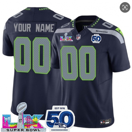 Men’s Seattle Seahawks Active Player Custom Navy 2025 F.U.S.E. Super Bowl LX Patch And 50th Season Patch Vapor Limited Stitched Jersey