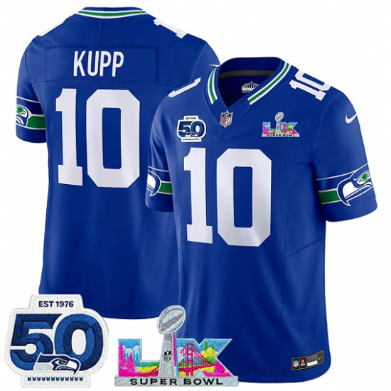 Men’s Seattle Seahawks#10 Cooper Kupp Royal 2025 F.U.S.E. Super Bowl LX And 50th Season Vapor Throwback Limited Football Stitched Jersey