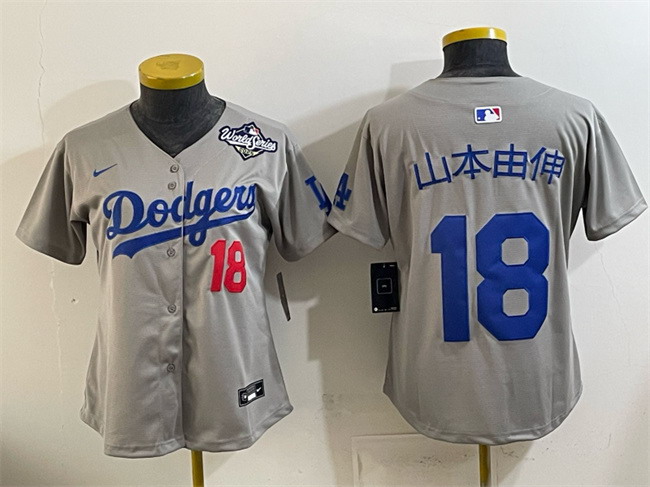 Women’s Los Angeles Dodgers #18 Yoshinobu Yamamoto Grey 2025 World Series Patch Limited Stitched Baseball Jersey(Run Small)