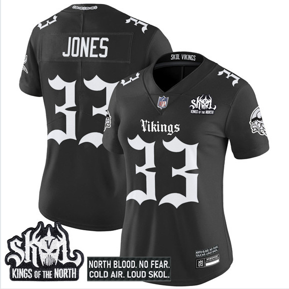 Women’s Minnesota Vikings #33 Aaron Jones Black 2025 Kings of the North Patch Gothic Norseblood Edition Vapor Untouchable Limited Stitched Football Jersey(Run Small)
