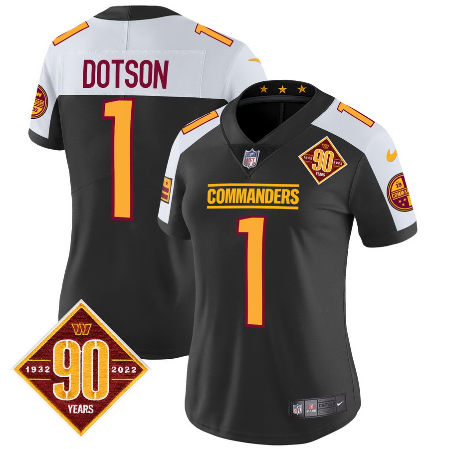 Women’s Washington Commanders #1 Jahan Dotson 90th Anniversary Patch Vapor Jersey Black Alternate